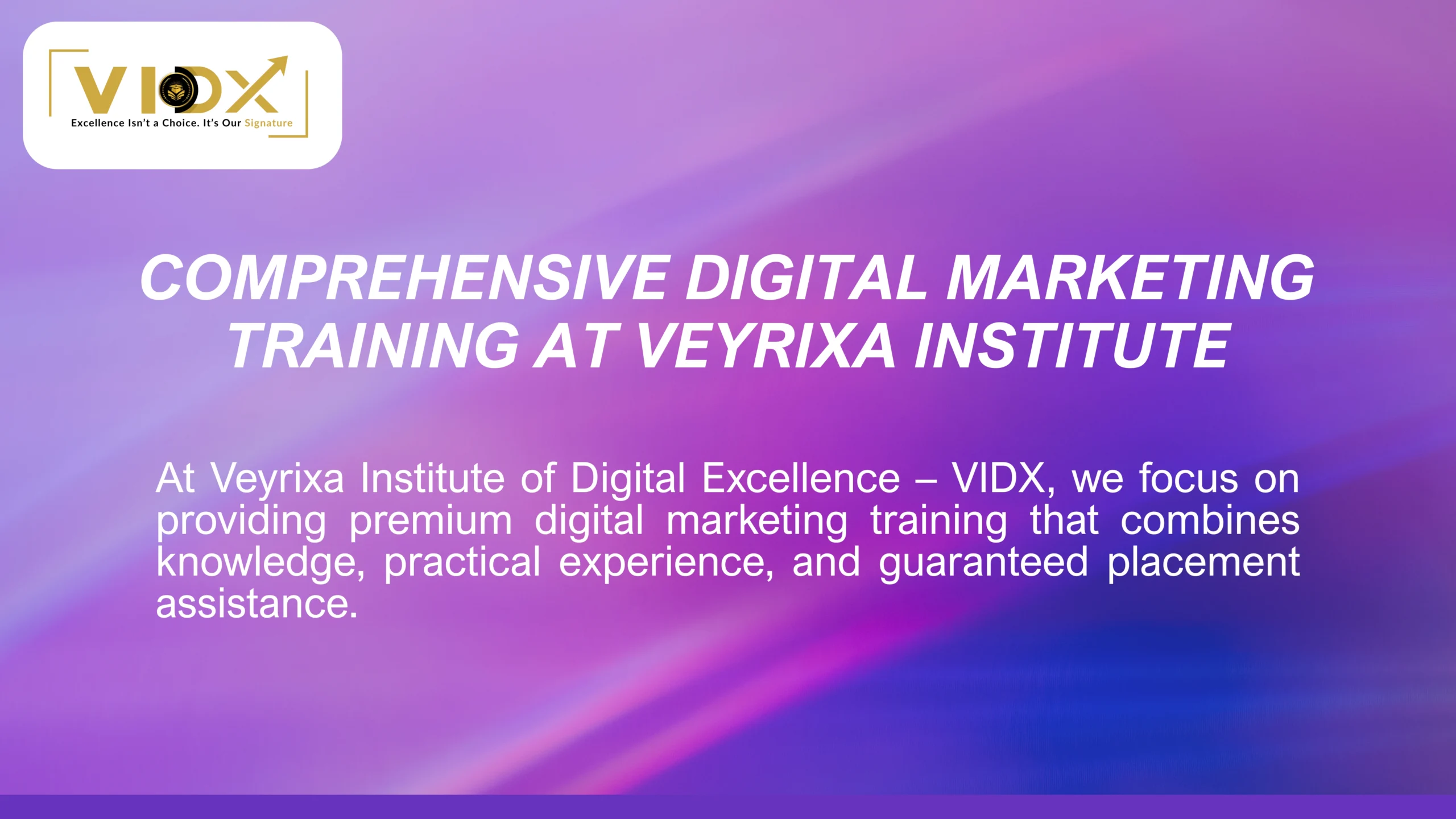 At Veyrixa Institute of Digital Excellence – VIDX, we focus on providing premium digital marketing training that combines knowledge, practical experience, and guaranteed placement assistance.